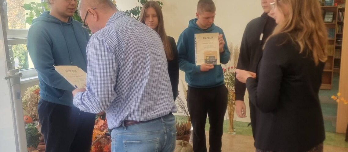 I miejsce ex aequo Kacper Łęga – III T Ż, Michał Motyliński kl. V TIP, Alicja Mąka kl. III TE